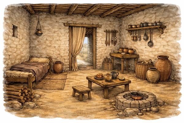 Dieser Raum hatte oft ungeputzte Wände und einen Boden aus gestampftem Lehm, manchmal mit einem Teppich bedeckt. Viele Menschen saßen auf dem Boden. Stühle waren selten und galten als Luxus. Geschlafen wurde auf einfachen Betten mit Matten – selbst gezimmert und ohne Komfort.