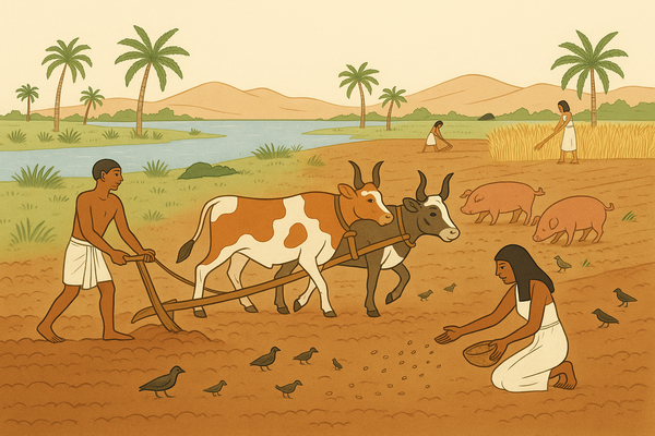 Nach der Überschwemmungszeit begann die eigentliche Arbeit: Die Bauern pflügten den Boden mit einfachen Holzpflügen, die von Kühen oder Ochsen gezogen wurden. Dann wurde der Samen mit der Hand ausgestreut.