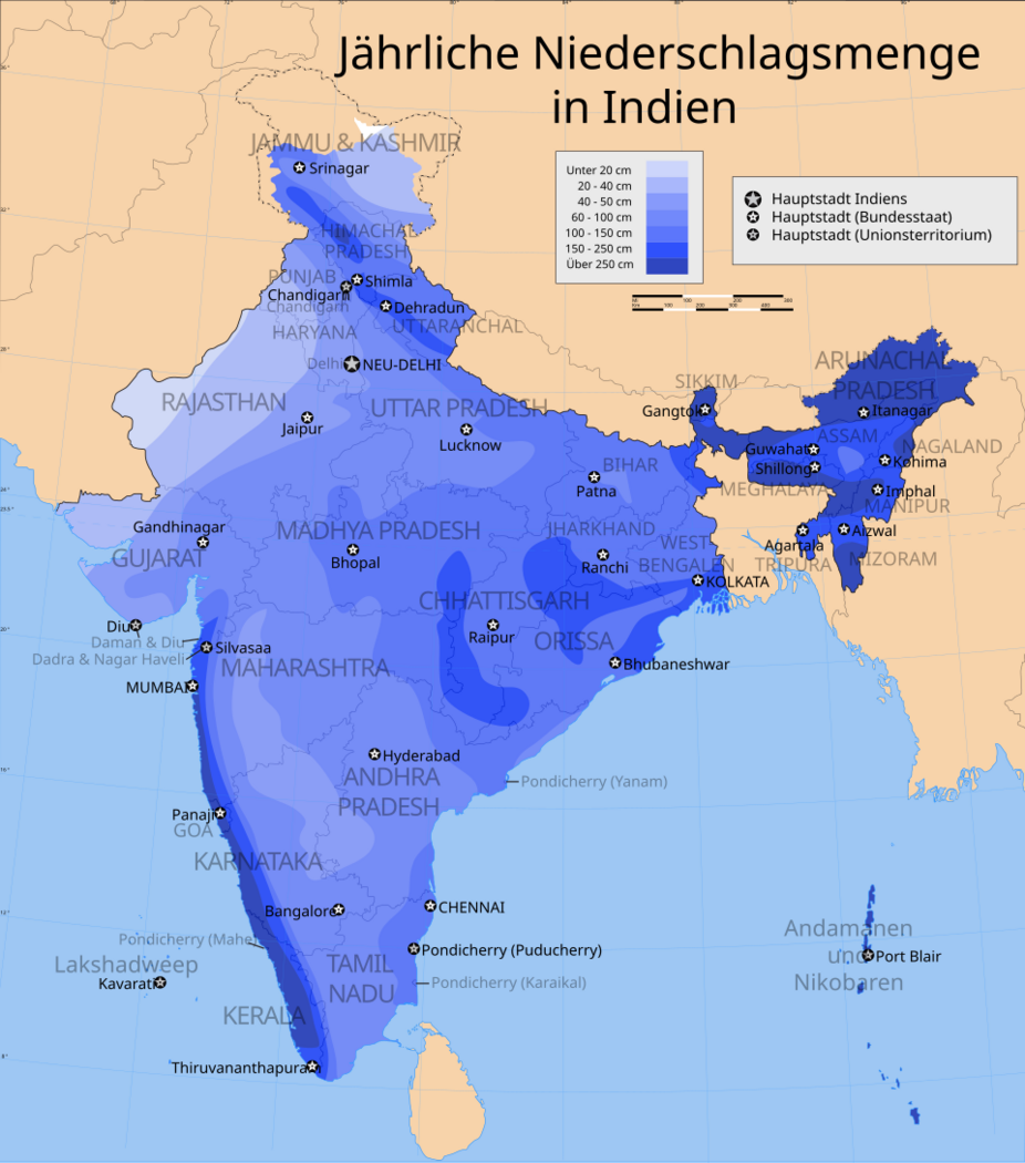 Der Sommermonsun weht ab Juni bis September. Er bringt viel Regen. Wenn der Sommermonsun vom Meer Richtung Land weht, hat er vorher viel Wasser aus dem Meer in den Wolken gespeichert. Erreicht der Monsun das Land, trifft er häufig auf Gebirge, wo sich die Wolken dann abregnen. Besonders an den Ghats und am Himalaya stauen sich die Regenwinde und bringen hier viel Regen. An der Grenze zu Pakistan im Westen nimmt der Niederschlag ab. In der Wüste Thar regnet es am wenigsten.